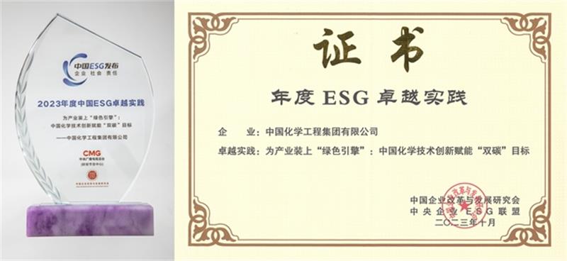 ESG是衡量企业可持续高质量发展的重要参照系。近年来,中国化学深入学习贯彻习近平生态文明思想,推广应用低碳零碳负碳技术,打造绿色低碳工厂和园区,助力绿色新材料低碳科技革命;积极参与生态环境治理,加快发展方式绿色转型,取得了显著成效。此次参评的ESG案例《为产业装上“绿色引擎”:中国化学技术创新赋能“双碳”目标》作为加强中国企业ESG建设、推动绿色低碳高质量发展的优秀案例代表之一,荣获“2023年度中国ESG卓越实践”奖。