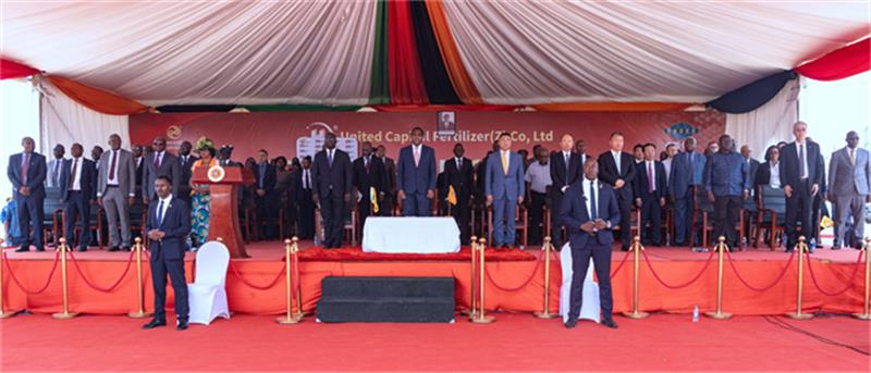 当地时间10月16日,赞比亚总统希奇莱马、中国驻赞比亚大使韩镜、中国化学董事长莫鼎革在赞比亚首都卢萨卡出席联合资本化肥项目试车庆典。赞比亚政府官员、中国化学副总经理武宪功等参加活动。